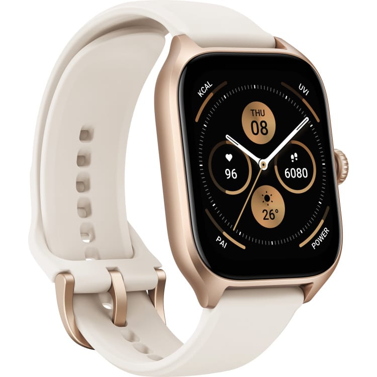 De Amazfit GTS 4 in Misty White is een elegante en functionele smartwatch met een briljant display, een bijzonder lange levensduur van de batterij en veel nuttige functies. Het 4,4 cm (1,75″) rechthoekige AMOLED-display met een resolutie van 348 x 442 pixels toont de wijzerplaten van de klok, de teksten en alle menu’s absoluut scherp, terwijl de batterij bijzonder beschermd is door de technologie en extra lang meegaat (tot 16 dagen). De behuizing van de Amazfit GTS 4 is gemaakt van aluminium en is waterdicht tot 50 meter. De BioTracker 4 PPG-sensor kan de gebruikelijke gezondheidsgegevens berekenen en nu ook het zuurstofgehalte in het bloed. Naast je stappen of verbrande calorieën registreert de Amazfit GTS 4 ook slaapgegevens, die je via de app voor iOS en Android kunt bekijken. De Amazfit GTS 4 beschikt over meer dan 150 sport modes waarvan acht automatisch detecteerbare sporten en meer dan 150 wijzerplaten. De Amazfit GTS 4 is via Bluetooth verbonden met het betreffende eindapparaat, bespaart batterijvermogen dankzij Bluetooth 5.0 (Low Energy) en heeft als extra highlight de mogelijkheid om met Alexa te praten door de smartwatch via Wi-Fi met het interne netwerk te verbinden. De Amazfit GTS 4 maakt gebruik van toonaangevende dual-band circulair gepolariseerde GPS-antennetechnologie – vergelijkbaar met die gebruikt in de luchtvaart en auto-industrie – zodat je kan genieten van sterkere positionering die 99% zo nauwkeurig is als top handheld GPS locators.