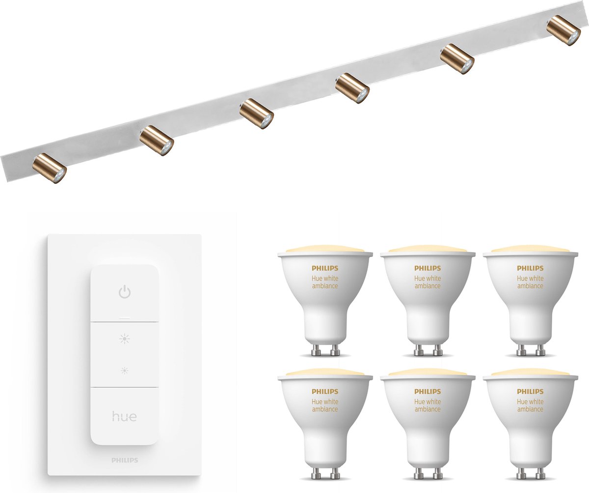 Slimme verlichting Wordt geleverd inclusief 6 Philips Hue White Ambiance GU10 spots & 1 Philips Hue Dimmer Switch.