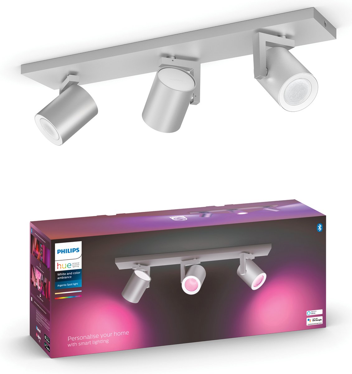 Creëer de perfecte ambiance met Philips Hue Argenta in aluminiumuitvoering. De Argenta heeft een rechthoekige voet en de 3 spots zijn voorzien van white and color ambiance LED-lampen met licht in 50.000 wittinten en 16 miljoen kleuren. Ideaal dus voor sfeer- en accentverlichting in je woonkamer en slaapkamer. Je kunt je nieuwe verlichting rechtstreeks bedienen via Bluetooth met de Philips Hue Bluetooth app op je smartphone of tablet. Wil je meer slimme verlichtingsopties? Verbind dan de lampen met de Philips Hue bridge, die je toegang geeft tot alle mogelijkheden, zoals het personaliseren van lichtscènes, het instellen van timers en nog veel meer.