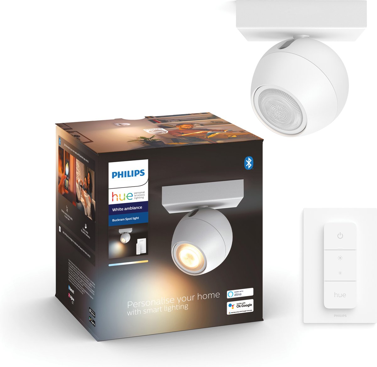 Makkelijke slimme verlichting De Philips Hue Buckram enkelvoudige opbouwspot bestaat uit een witte vierkante basisplaat en een witte bolvormige spot. De spot is uitgerust met een White ambiance LED-lamp die je de keuze biedt uit warm tot koelwit licht. Je bent er dus mee voorbereid op elke situatie, van lekker ontspannen tot geconcentreerd lezen. Je kunt de lamp op meerdere manieren draadloos bedienen: met de Hue app of met de meegeleverde Philips dimmer switch. Je kunt dan kiezen uit vier verschillende lichtstanden, in- en uitschakelen en dimmen. Als je de lamp verbindt met een Philips Hue Bridge krijg je toegang tot uitgebreide functies, zoals timers en routines.