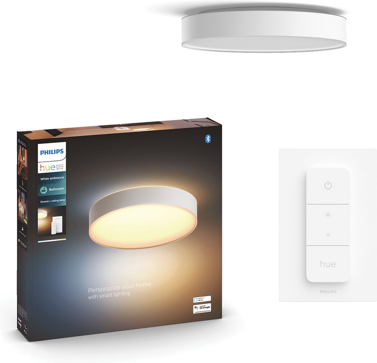 Het licht in jouw badkamer bepaalt de mate van luxe die jij ervaart. Kies daarom voor de witte Philips Hue Devere badkamerplafondlamp (diameter 38cm) en pas het licht helemaal naar wens aan. Door de compacte en slanke vormgeving kun je de smart lamp eenvoudig monteren en versterkt hij het ruimtelijke gevoel in je badkamer. Met de 50.000 wittinten van de White ambiance LED-lamp heb je altijd de juiste verlichting voor elk moment. Helder en fris in de ochtend, ontspanning in de avond! Je kunt het licht precies instellen zoals jij dat wilt via Bluetooth en de Hue app. Nog makkelijker wordt het met de dimmer switch. Creëer snel de perfecte sfeer met deze afstandsbediening door je lampen te dimmen of feller te zetten of hang de slimme schakelaar op een handige plaats op. De Devere is ontworpen met beschermingsklasse IP44, dus speciaal ontworpen voor natte omgevingen. Krijg je niet genoeg van …