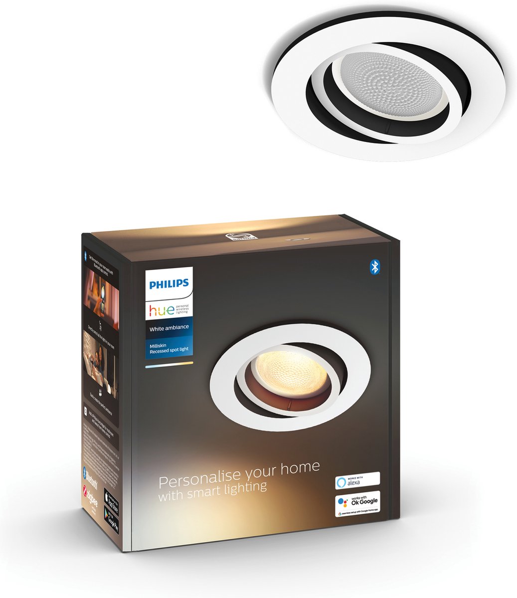 De verzonken witte Philips Hue White ambiance Milliskin inbouwspot voegt zich naadloos in zijn omgeving en levert daar direct warm- tot koelwit licht. Draadloze bediening met de Bluetooth app of de meegeleverde Hue dimmer switch. Activeer meer slimme lichtfuncties met een Hue Bridge.