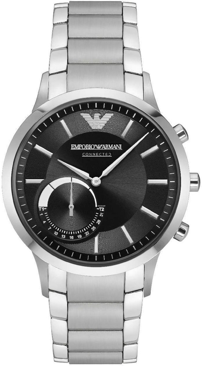 Emporio Armani introduceert wearables met de Emporio Armani Connected collectie van Hybrid Smartwatches. Het design van Emporio Armani in combinatie met de voordelen van de hedendaagse wearable technologie. Door de hybride smartwatch te linken aan je Apple of Android smartphone via bluetooth, heeft dit horloge functies zoals de automatische tijd- en datumaanpassing voor op reis, activiteiten- en doel tracking, slaap tracking, subtiele notificaties van geselecteerde personen en apps, dual-time functie en een alarm. De Emporio Armani Connected App geeft de mogelijkheid om met één druk op de knop een foto te nemen of jouw muziek te bedienen.