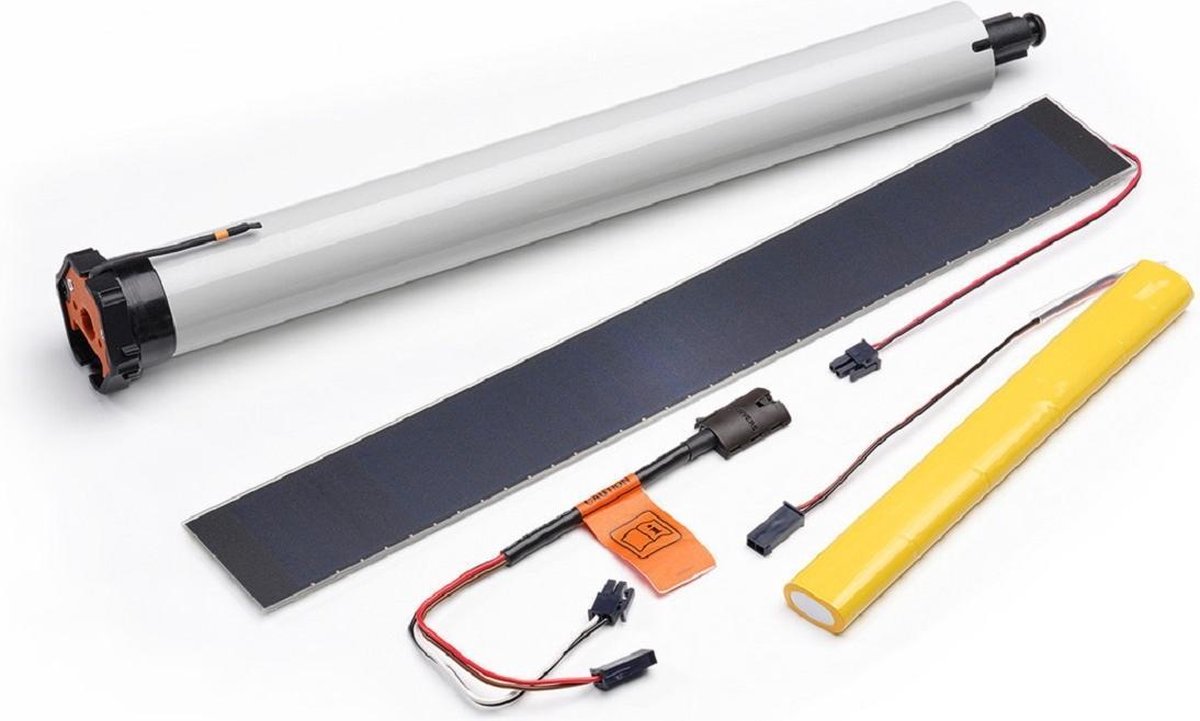 RolSolar M-868 DC zonne-energie buismotor set Deze set bestaat uit een motor, zonnepaneel, voedingskabel en accu, u dient er nog wel een adaptieset, motorsteun en zender bij te bestellen.