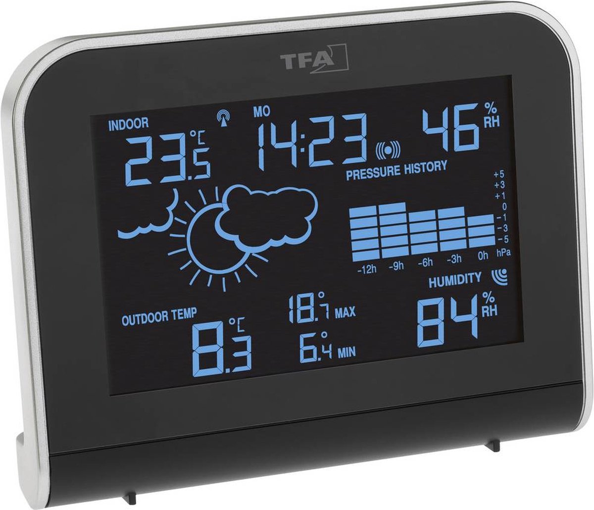 Features Contrastrijk en kleurintensief ‘Color Sharp’-display met verschillende instelmogelijkheden: Automatische wisseling tussen 600 kleurnuances, wisseling naar buitentemperatuur of vaste kleur – 22 kleuren mogelijk 3 helderheidsniveaus Draadloze overdracht van de buitentemperatuur en luchtvochtigheid via een zender (max. 100 m) Binnentemperatuur en -luchtvochtigheid Max./min.-functie voor temperatuur Weersverwachting Luchtdruktendens, grafische weergave van het luchtdrukverloop van de laatste 12 uur Zendergestuurde klok met alarm en datumweergave Combinatie met WeatherHub-Gateway mogelijk Beveiligd TFA-design